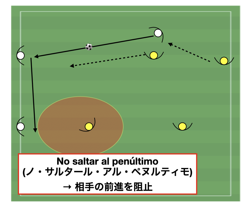 No saltar al penúltimoは、本来守るべきスペースを手放す=リスクに警鐘を鳴らす守備原則です。